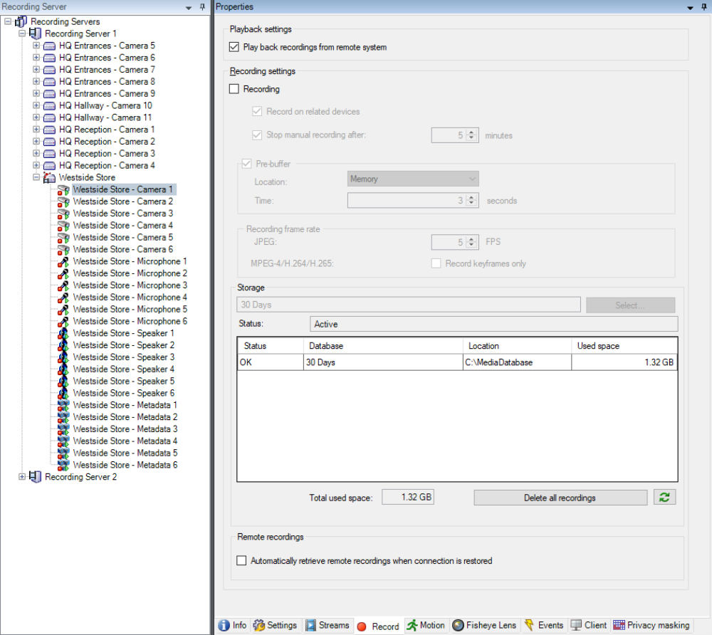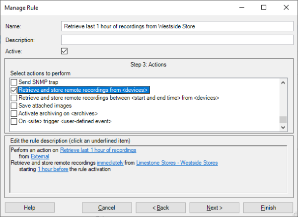In addition to standard recording on rules, the remote site can be used as a kind of “edge storage” device for recovering missing recordings in case of network or recording server issues by selecting the ‘Automatically retrieve remote recordings when connection is restored‘ checkbox.