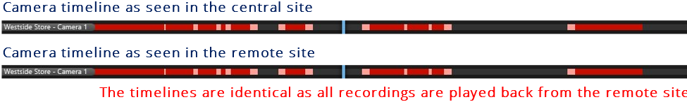 With recording enabled in the central XProtect Corporate system, the timeline for users connected to the central site will not necessarily be the same as for users connected directly to the remote site. This is because each site records by its own rules and because recordings can be retrieved (copied) from the remote site to the central site.