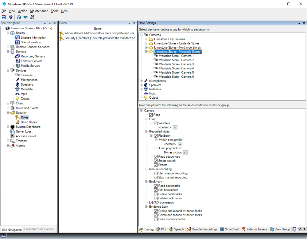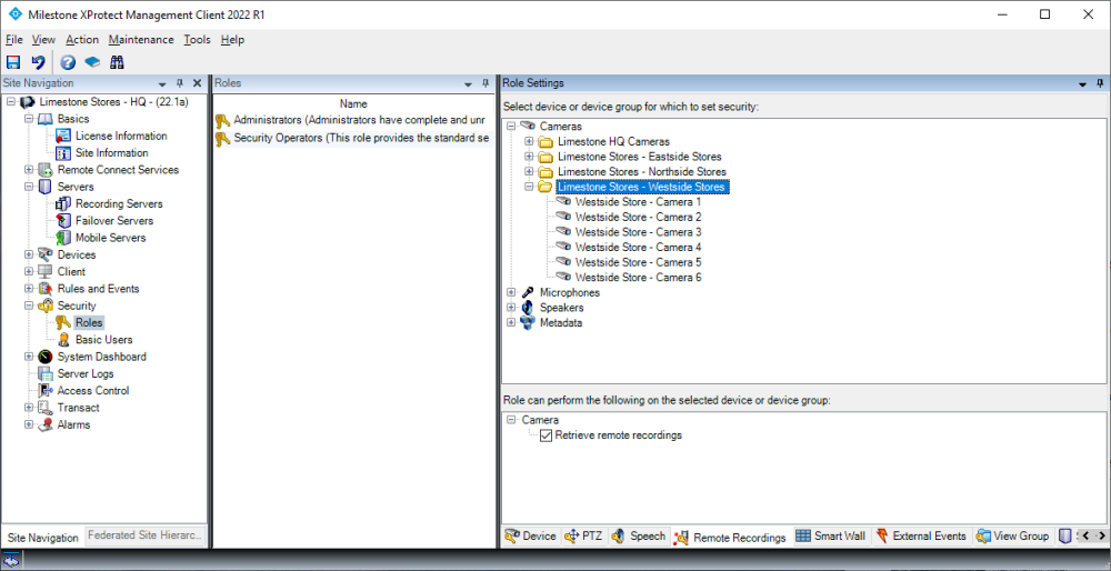 Configuration of user rights for the interconnected devices (cameras, microphones, speakers, metadata, inputs, and outputs) are done in the same way as for regular devices, by creating a “Role” and assigning access to the devices and functions.
