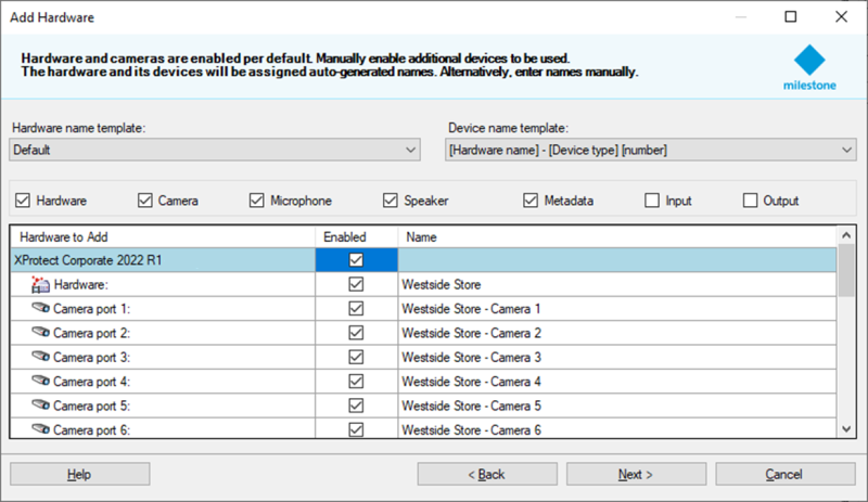 These default auto-assigned names can be changed for the central XProtect Corporate site in the Add Hardware dialog or later by using the standard functions of the XProtect Management Client like for normal cameras. Doing this will not change the names on the remote site. In this way, you can ensure that cameras will have unique names in the central site, even though cameras may reuse the same names across the interconnected sites.