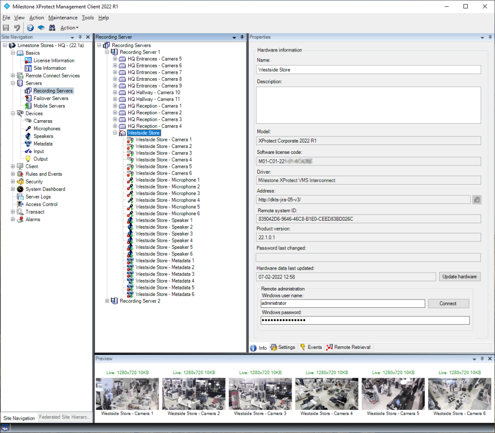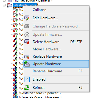 Furthermore, it has an ‘Update Hardware’ function which refreshes the configuration to match what can be accessed on the interconnected site. This function must be used if changes are made on the interconnected site, such as adding a new camera that should be available to the central site.