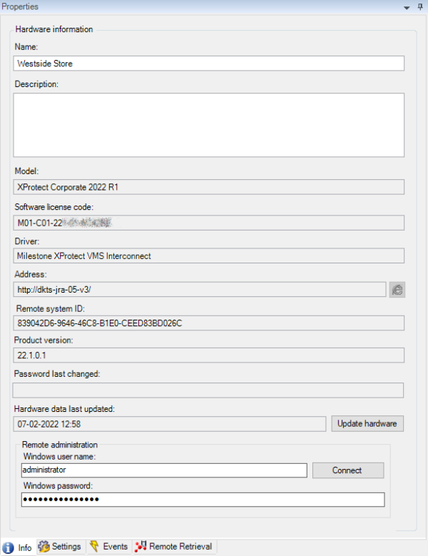 The interconnected remote site has a few tabs for displaying site information and for configuring settings, events, and remote recording retrieval.