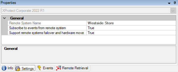 If the name of the remote site has been changed in the central XProtect Corporate site, the ‘Settings’ tab will display the remote site’s original name. The same applies to cameras and other devices when selecting the ‘Settings’ tab for these.