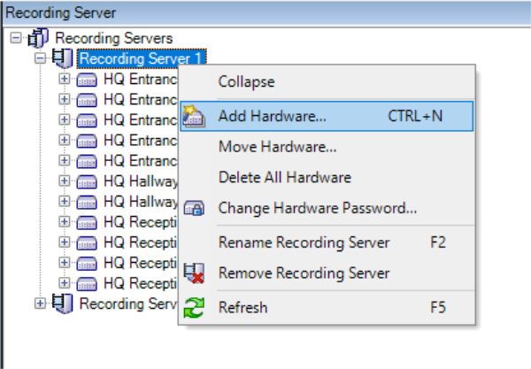 Remote sites are added to the central XProtect Corporate site via the XProtect Corporate recording servers, in the same way, cameras and video encoders are added by using the ‘Add Hardware‘ wizard.