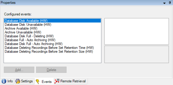 The ‘Events‘ tab lists the system events that are available from the remote interconnected site. The events that are supported depend on the specific XProtect VMS or Husky product used on the remote site.