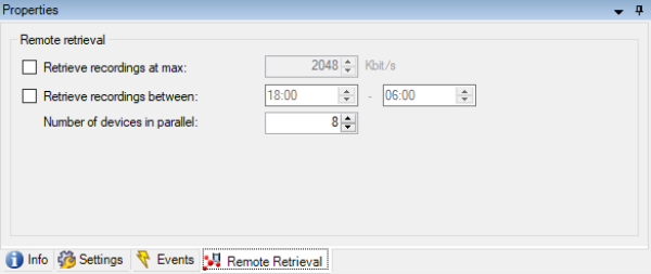 Finally, the number of devices to retrieve recordings from in parallel can also be set here. The default is eight devices in parallel, but this can be increased to better utilize the bandwidth, if a lot of bandwidth is available.
