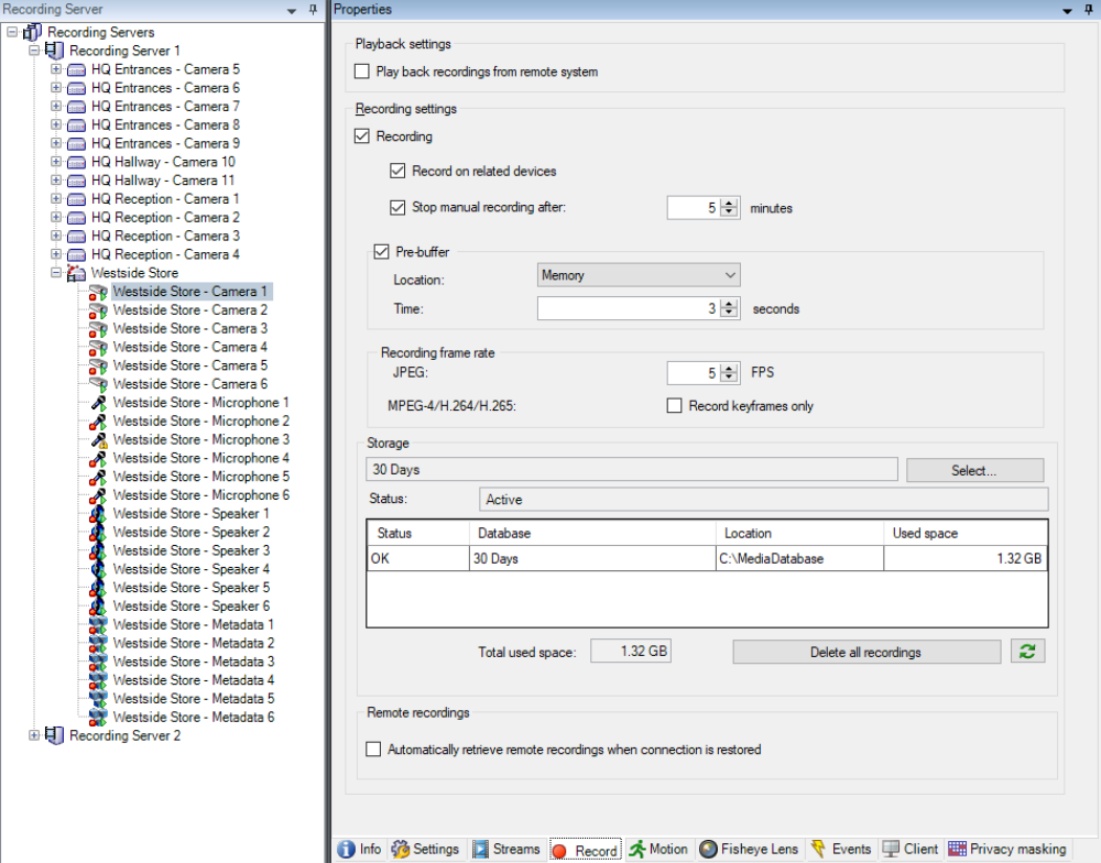 When recordings are set to be done in the central XProtect Corporate site, the standard XProtect Corporate recording settings can be used like for normal cameras. The same applies when creating rules controlling when video, audio, or metadata is recorded.