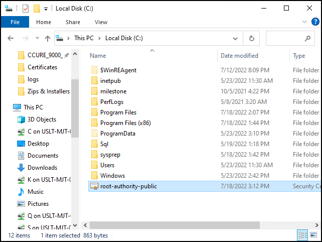By default the script places the new root certificate in the C:\ file location. Move the certificate to the server that hosts the CCure XProtect Access Service.