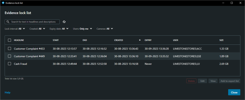 When an Evidence Lock is selected in the list, it is possible to directly play back or export the recordings. Furthermore, if the user has the security permissions for it, it is possible to edit parameters of the evidence lock and add or remove devices from the evidence lock