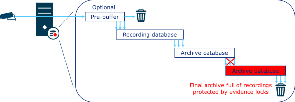 In case the final storage location in a storage definition becomes full of recordings protected by evidence locks, the recordings in the previous storage location are deleted rather than archived to make room for new recordings.