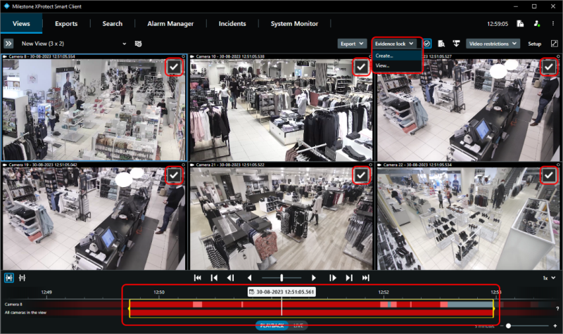 Evidence locks are created using the XProtect Smart Client. To create an evidence lock, select ‘Playback’ and select a time period to lock via the timeline, or enter the start/stop time manually, and then select the cameras in the view to include. Finally, click the ‘Evidence Lock’ control and select ’Create’.