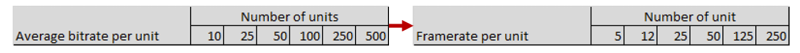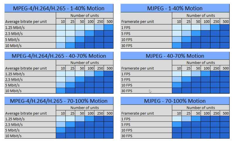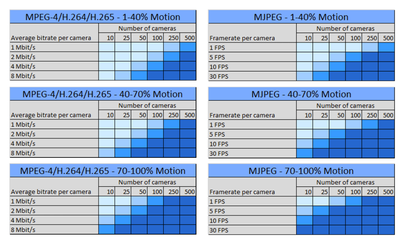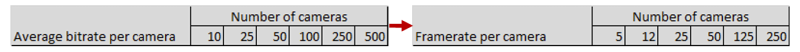 The reason the 'per camera’ units in the below tables are different for cameras using MPEG and MJPEG is that for MPEG devices, video is by default received as one GOP per second regardless of the framerate, and thus is stored as a single record in the media database per second no matter the framerate. So with MPEG it is the bitrate that mostly matters and not the framerate.