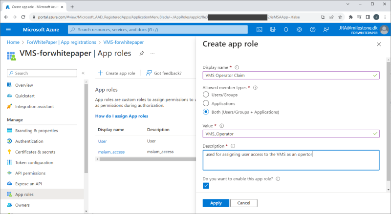 The roles and their values created here, can be used as claims in the XProtect VMS to automatically link the Microsoft Entra ID users to the XProtect VMS roles. This, though, requires that the Microsoft Entra ID user that is added to the app in the next step, is assigned this app role.