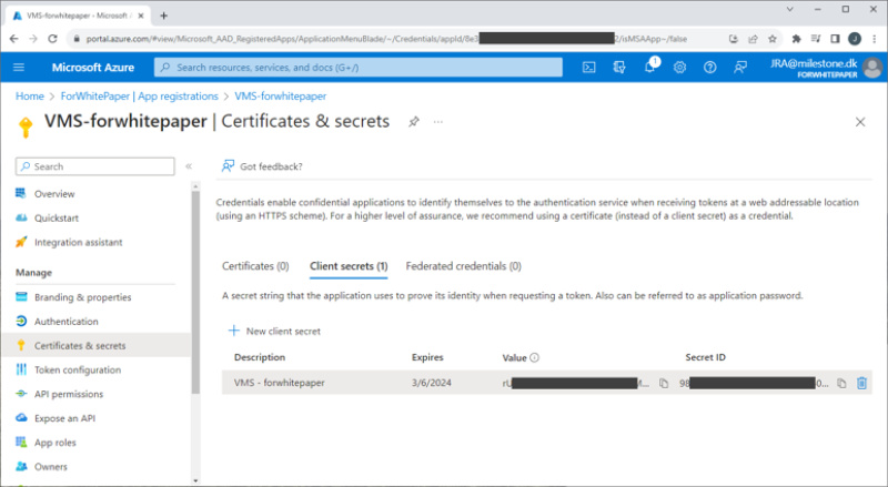 Important: The secret value is only shown on this page immediately after it is created and it cannot be viewed again after navigating away from the page. This secret is needed in the XProtect VMS for the external IDP integration, so make sure to copy it and save it somewhere safe. If the secret is lost or you forgot to copy it, it is possible to create a new one and use it going forward.