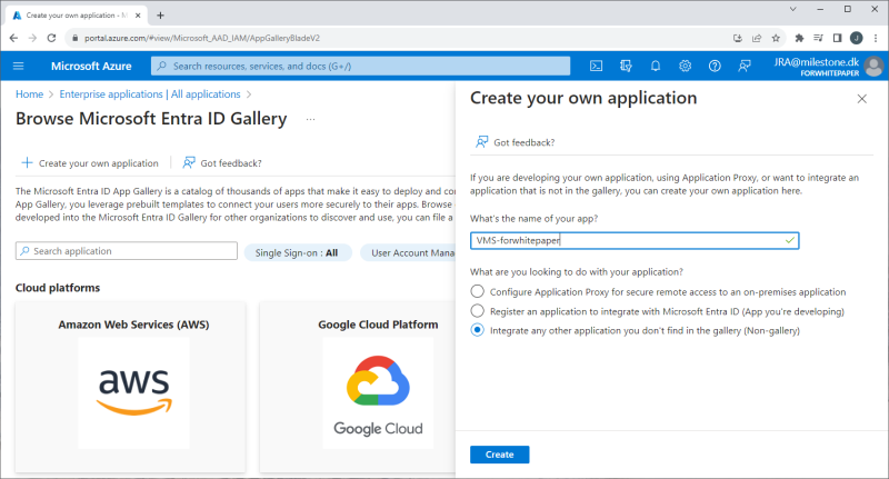 An Enterprise application is added by selecting ‘Enterprise applications’ and clicking ‘+ Create your own application’. In the new dialog, give the application a name, and select the radio button option called ‘Integrate any other application you don’t find in the gallery (Non-gallery)’.
