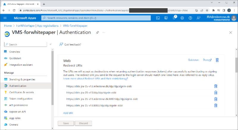 If the redirect URI is configured incorrectly, an error message will be show during authentication, stating that the redirect URI is incorrect. For example: ‘The redirect URI https://vmsserver.limestonestores.com:8082/index.html/idp/idp/signin-oidc specified in the request does not match the redirect URIs configured for the application…‘. The address shown here is the correct one to set as a redirect URI.