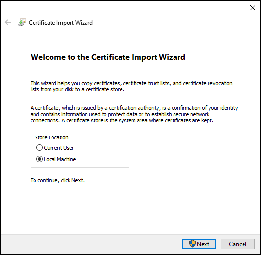 1. Choose to place the certificate in the Store Location of the Local Machine.
