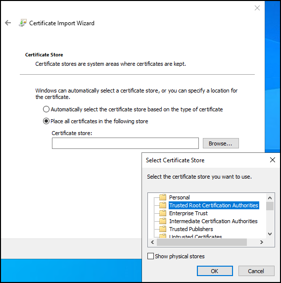 1. Browse and import the certificate in to the Trusted Root Certification Authorities folder.