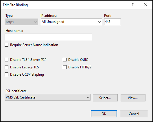 1. Choose to edit the https binding, select the imported certificate from the SSL certificate list, click OK and close the Site Bindings menu.