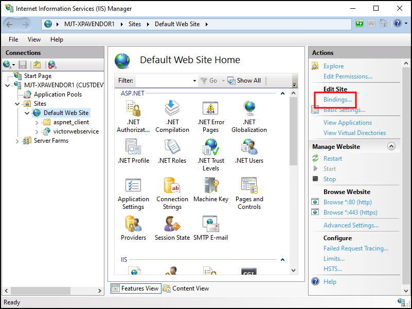 1. The final step in this process involves binding the certificate to the IIS server supporting the victor web service. In the IIS Manager application on the victor web service host server, open the Bindings... menu of the Default Web Site.