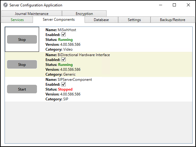 On the Server Components tab, on the line indicating the Category: Video, observe the status for the MiSwhHost server component. If the status indicates Stopped, select the Enabled checkbox and click the Start button. This server component should indicate a status of Running.
