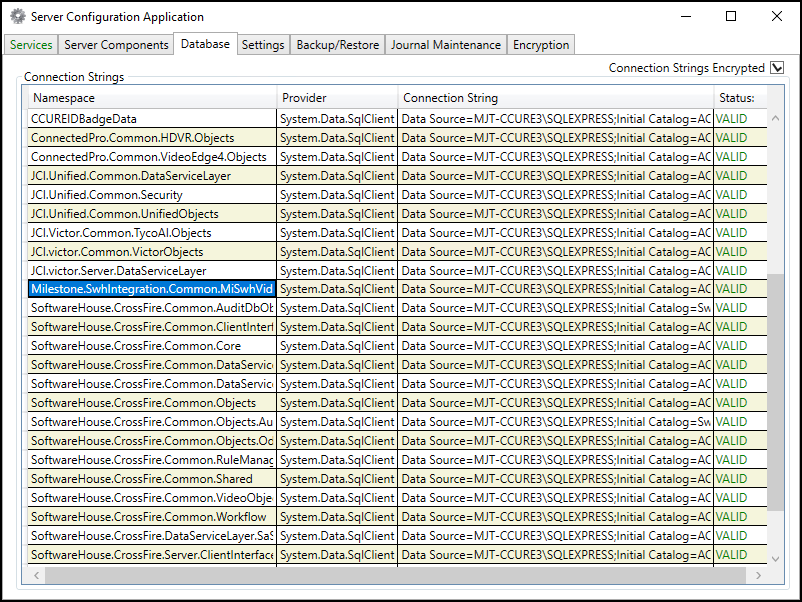 The Database tab displays the status of all connection strings. By default, the list is in alphabetical order by Namespace. If the Status column indicates INVALID for the Milestone.SwhIntegration.Common.MiSwhVideoObjects item, edit the Connection String to point to the correct path of the CCure Database, then restart the CrossFire services.