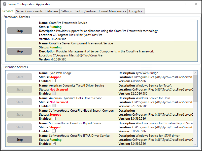 In the Services tab, check the status of the two services CrossFire Framework Service and CrossFire Server Component Framework Service. What you must do in the next step, depends on their status.