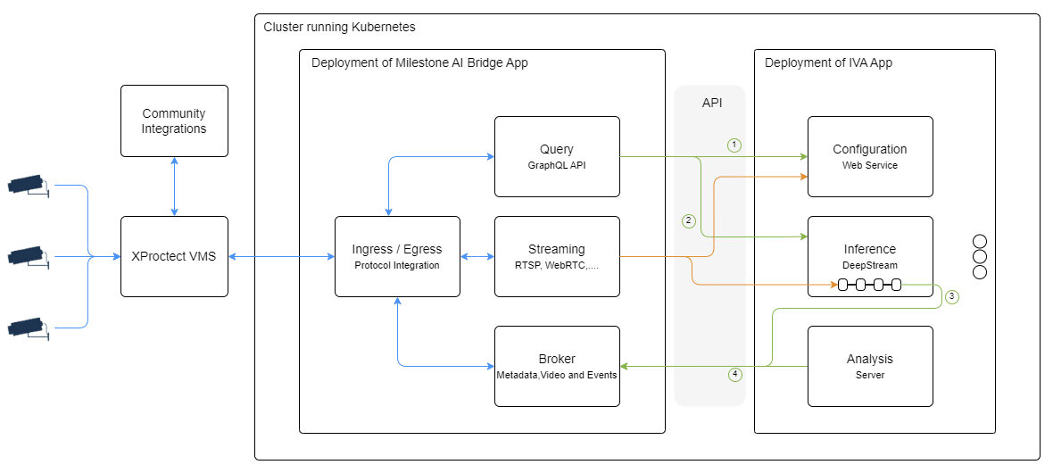 The API's that the Milestone AI Bridge expose to the IVA application are all internal to the cluster network and cannot be accessed from the outside (unless deployed in debug mode). However, all communication going into the cluster and leaving the cluster must be secured.