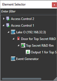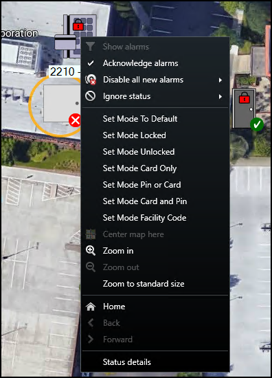 It's possible to place doors, readers, inputs, outputs, panels, and OnGuard server(s) on an existing Smart Client map. The map icons can display hardware status and execute commands.