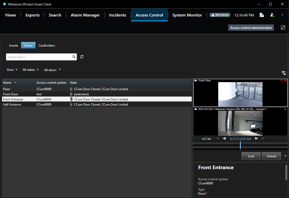 The XProtect Access CCure integration adds a new workspace, or tab, into the XProtect Smart Client. The Access Control workspace should appear in the Smart Client.
